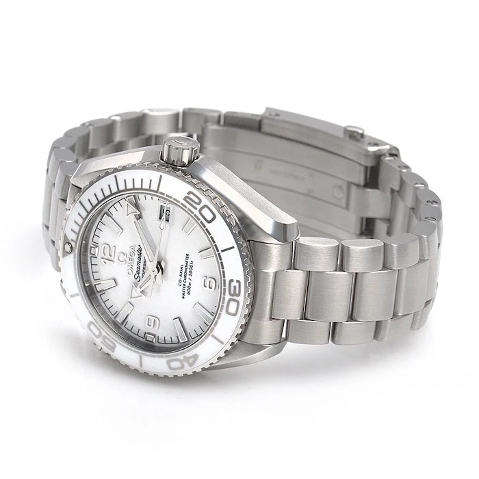 This model, with its scratch-resistant sapphire crystal, features a white ceramic dial with Arabic numerals and a date window at the 3 o’clock position. The white ceramic unidirectional bezel with OMEGA Liquidmetal™ diving scale is mounted on a 39.5 mm stainless steel case.