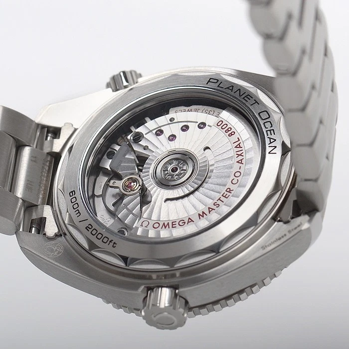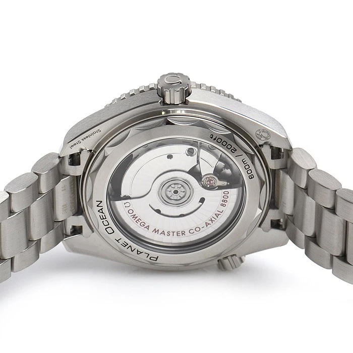 The OMEGA Seamaster Planet Ocean 600M Master Chronometer is water resistant to 600 metres / 2000 feet / 60 bar, and has a helium-escape valve. The OMEGA Master Chronometer calibre 8800 at the heart of this timepiece can be seen through the transparent caseback. To achieve Master Chronometer status, it has passed the 8 rigorous tests set by METAS (The Swiss Federal Institute of Metrology).
