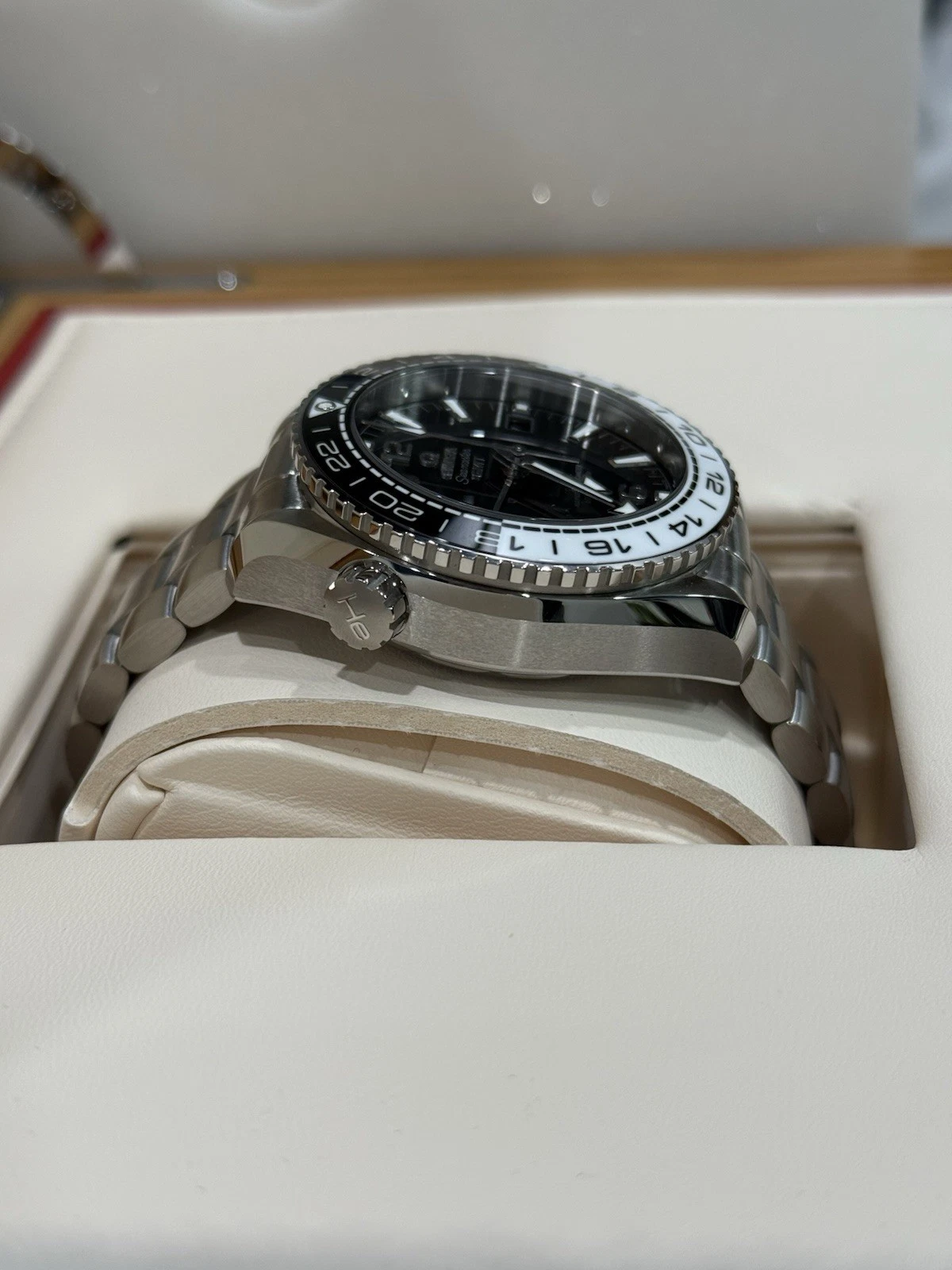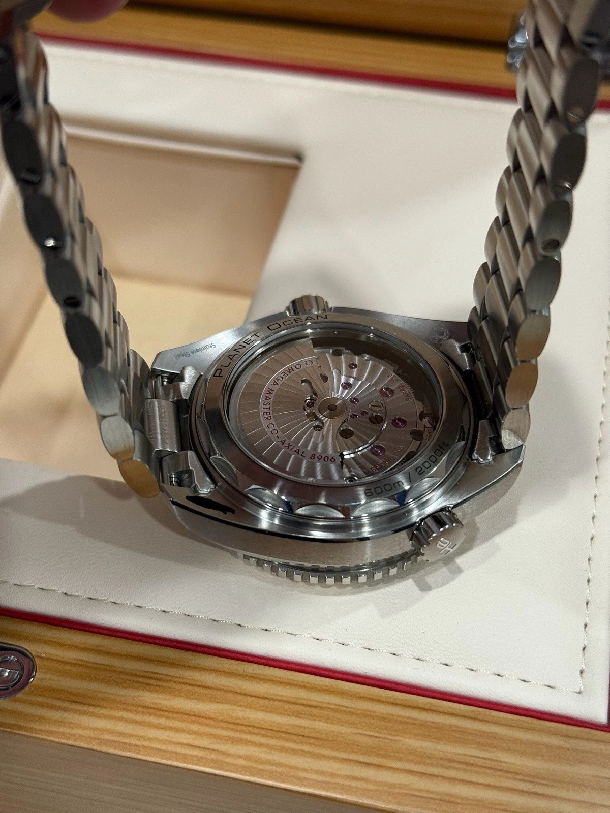 The OMEGA Seamaster Planet Ocean 600M Master Chronometer GMT is water resistant to 60 bar (600 metres / 2000 feet), and has a helium-escape valve. The OMEGA Master Chronometer calibre 8906 at the heart of this timepiece can be seen through the transparent caseback. To achieve Master Chronometer status, it has passed the 8 rigorous tests set by METAS (The Swiss Federal Institute of Metrology).