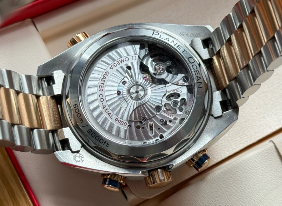 The OMEGA Seamaster Planet Ocean 600M Master Chronometer Chronograph is water resistant to 60 bar (600 metres / 2000 feet), and has a helium-escape valve. The OMEGA Master Chronometer calibre 9900 at the heart of this timepiece can be seen through the transparent caseback. To achieve Master Chronometer status, it has passed the 8 rigorous tests set by METAS (The Swiss Federal Institute of Metrology).