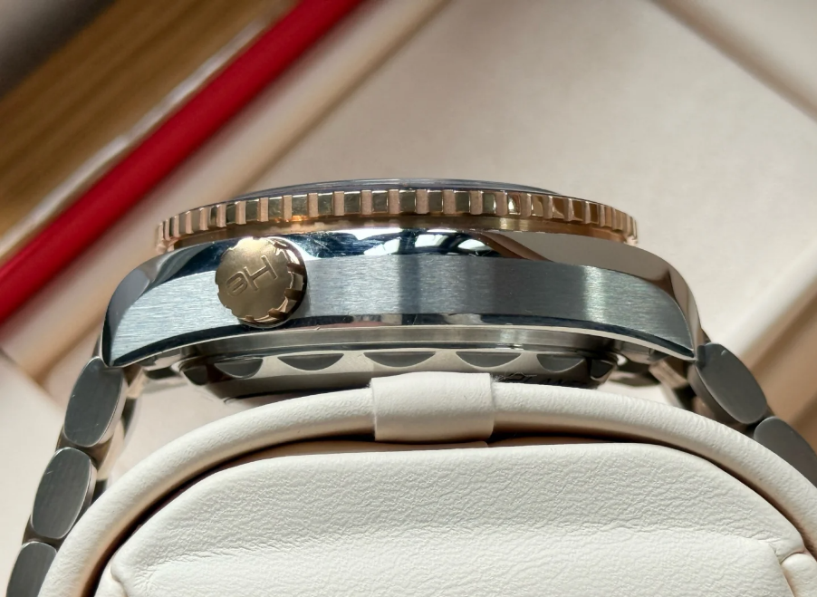 Helium escape valve: Decompression system which allows helium to escape from inside the watch when the watch is worn for professional use in pressure chambers. (Long-term underwater work, crude oil exploration, etc.)