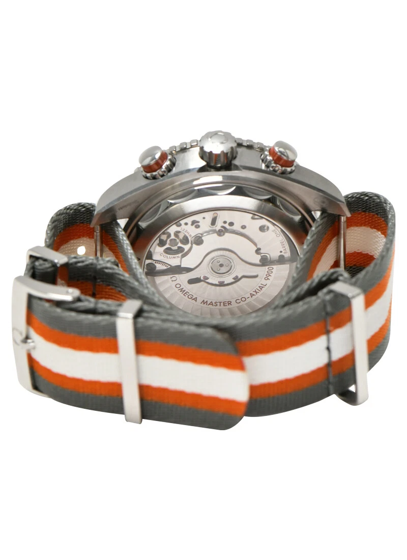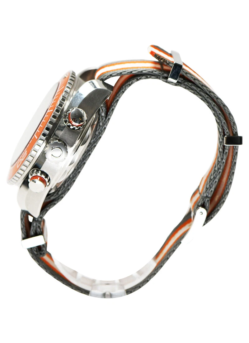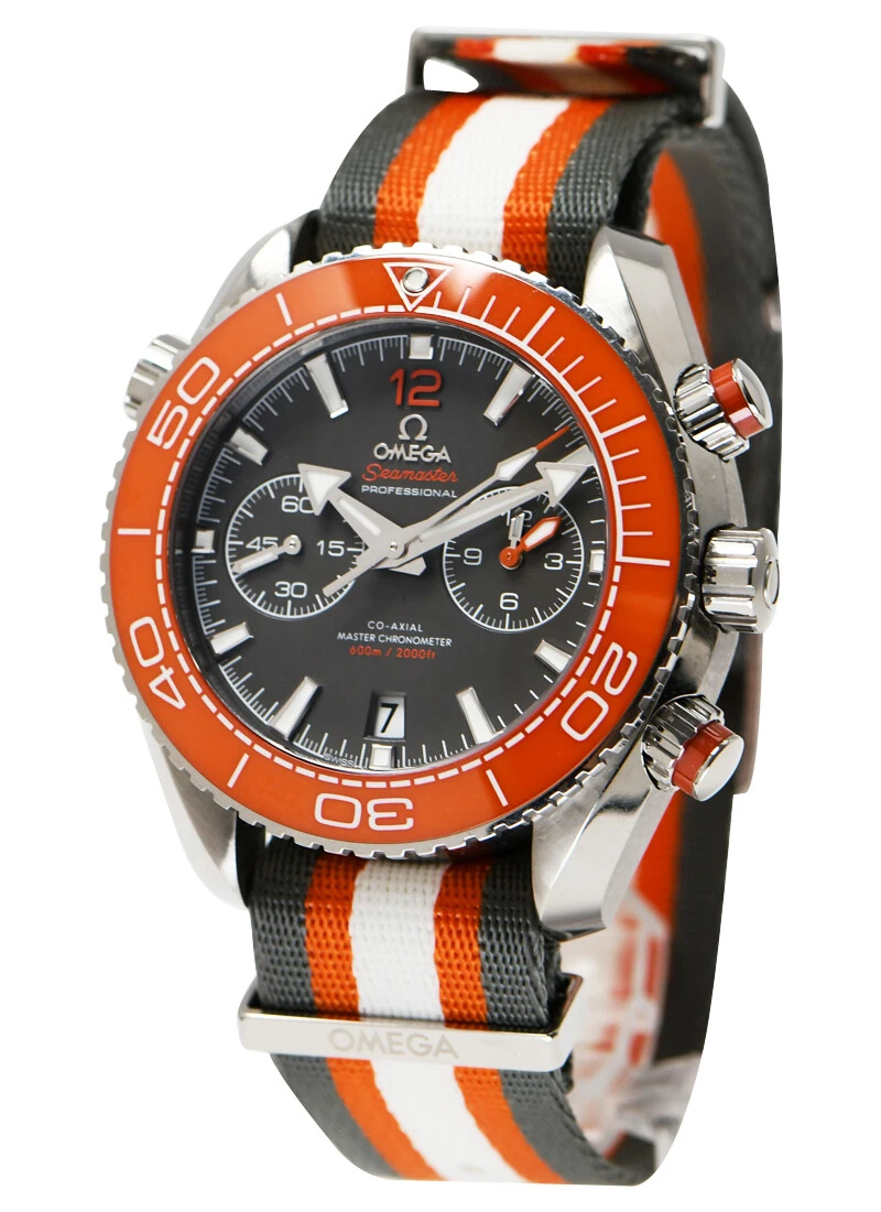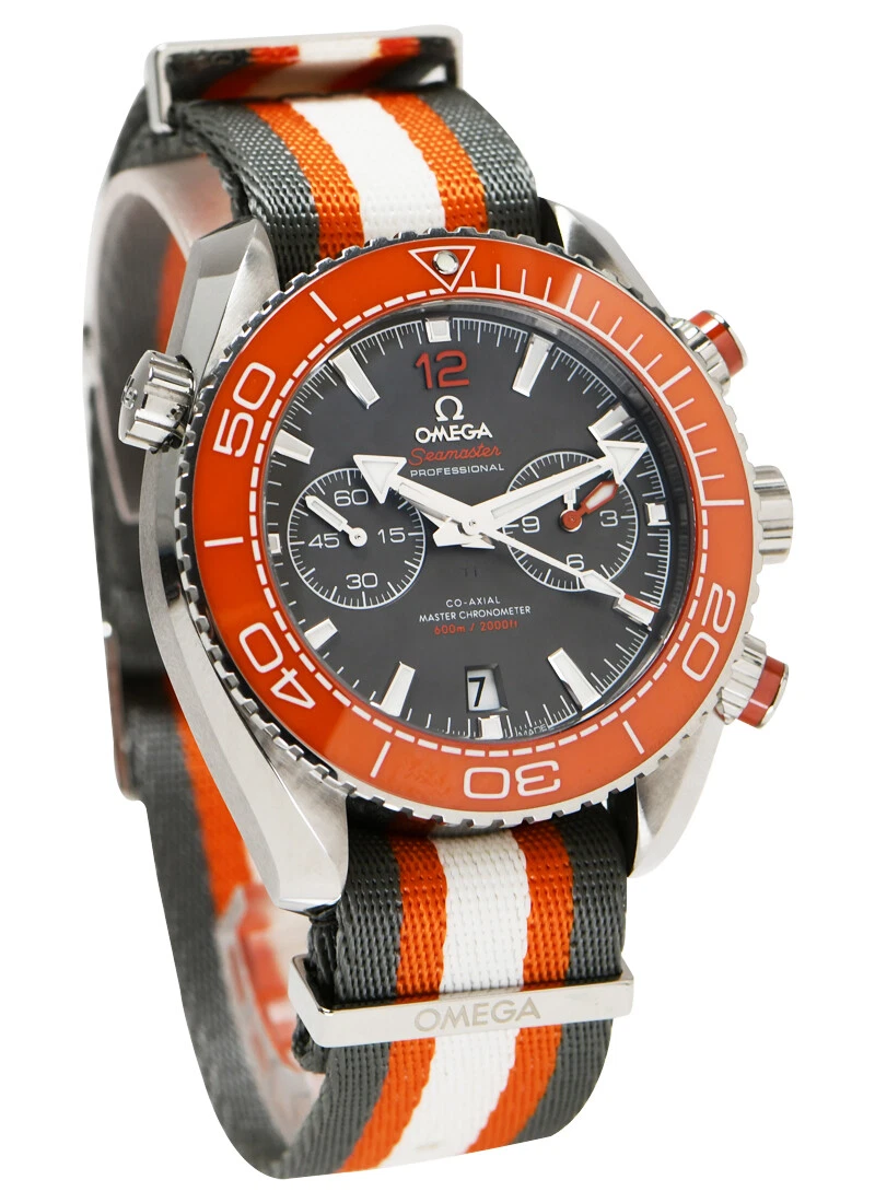 It was with OMEGA’s maritime legacy in mind that the brand launched its Planet Ocean line in 2005. Today, the stylish models continue to pay homage to OMEGA’s dive watch heritage.This 45.50 mm stainless steel model features a ceramised titanium dial with a small seconds counter and a date window, as well as 60-minute and 12-hour counters at the 3 o'clock position. Orange ceramic is used on the rings of the pushers and also for the unidirectional bezel with its diving scale filled with liquid ceramic and Super-LumiNova.Other features include an alveol screw-in caseback and a 5-stripe orange, grey and white polyamide NATO strap with a polished buckle and strap keepers in stainless steel.The watch is water resistant to 600 metres / 2000 feet / 60 bar and has a helium-escape valve. The OMEGA Master Chronometer calibre 9900 at the heart of this timepiece can be seen through the transparent caseback. To achieve Master Chronometer status, it has passed the 8 rigorous tests set by METAS (The Swiss Federal Institute of Metrology).