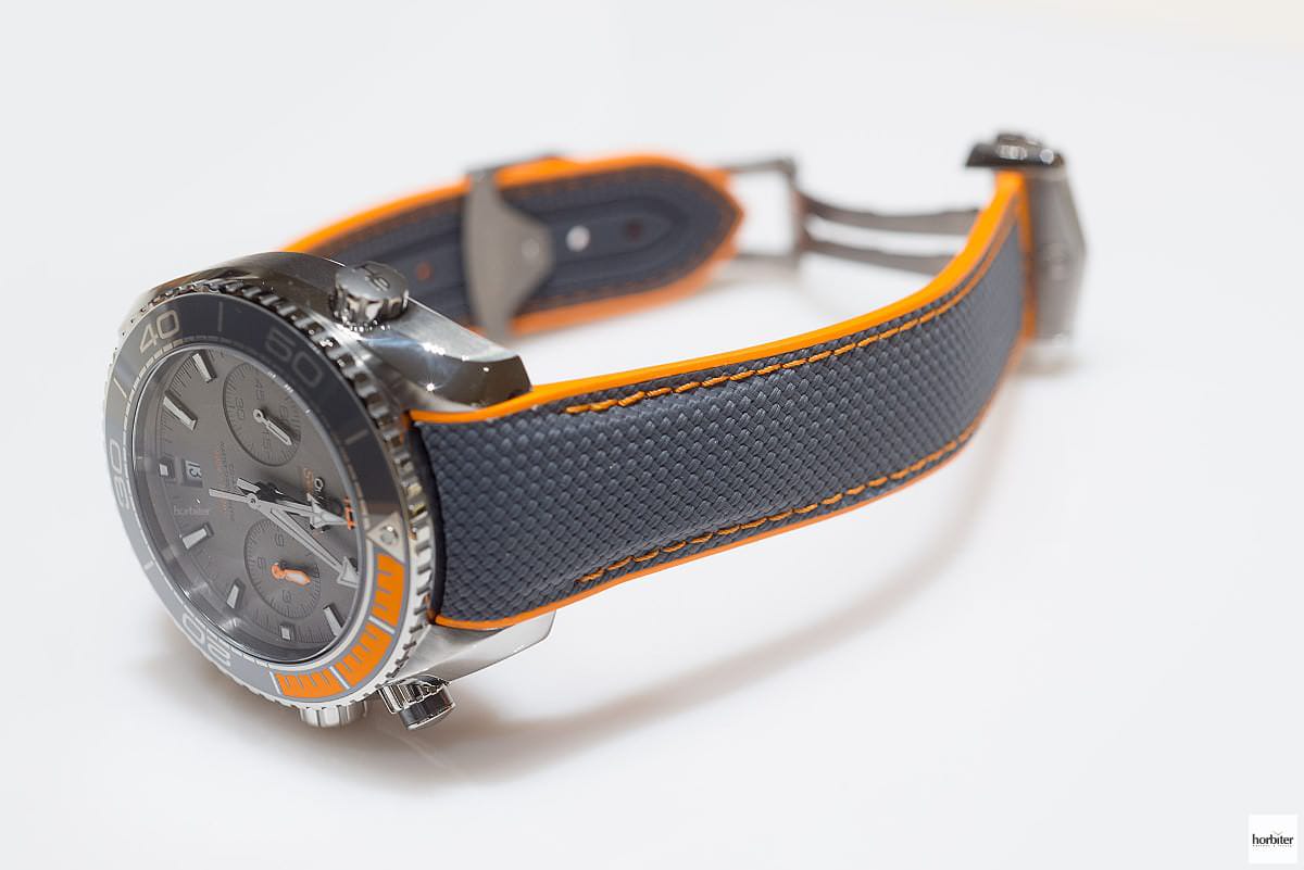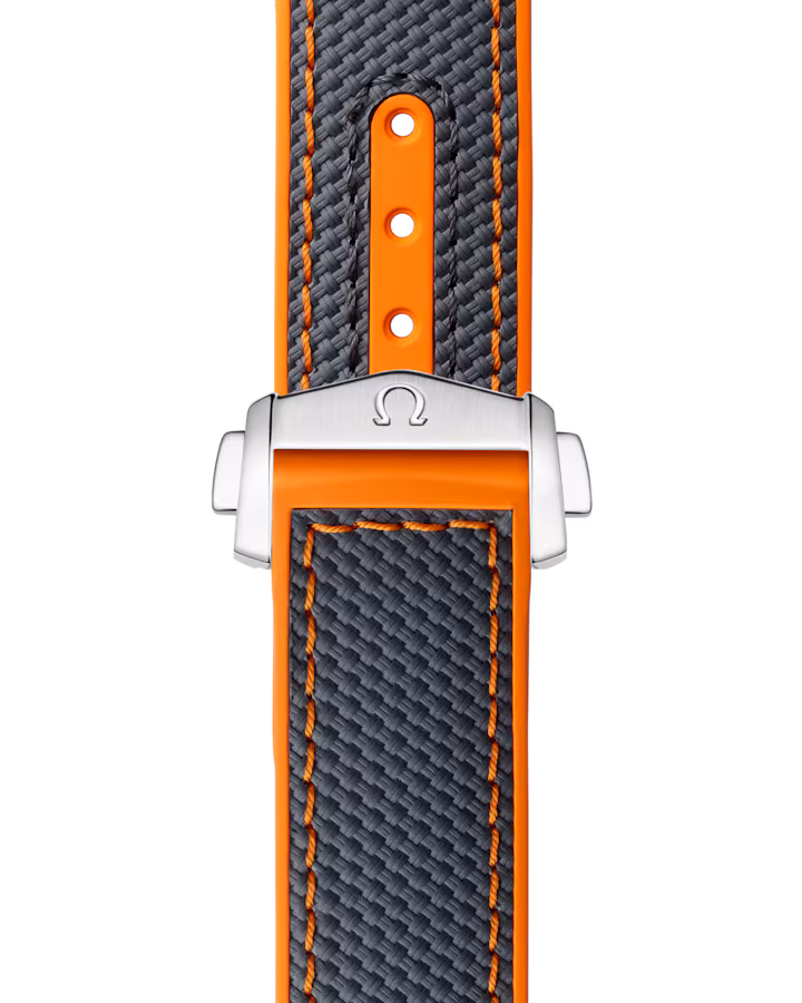 Other features include an alveol screw-in caseback and a grey structured rubber bracelet with orange stitching and lining.