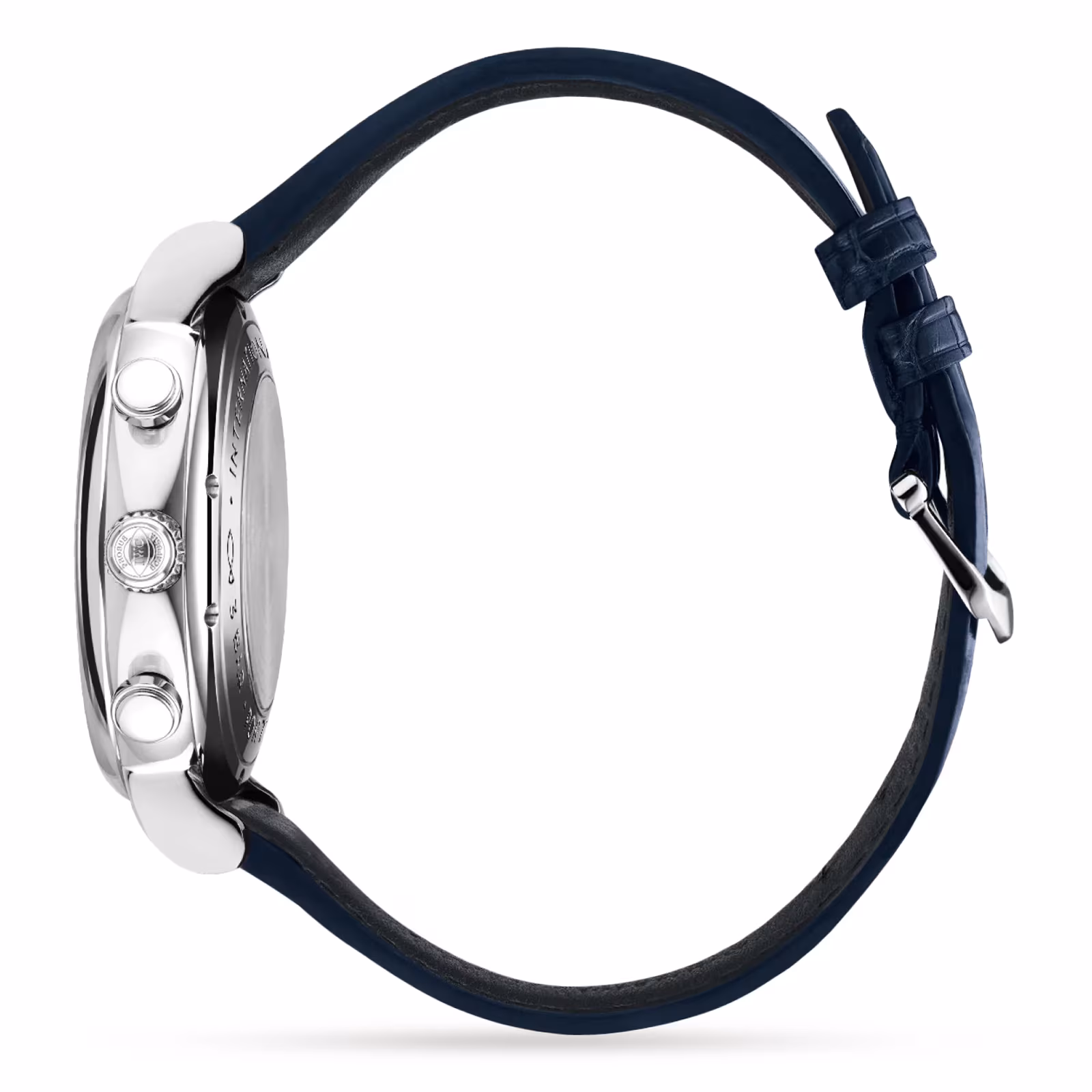 - Presented in a 42mm stainless steel case secured with a blue alligator style leather strap