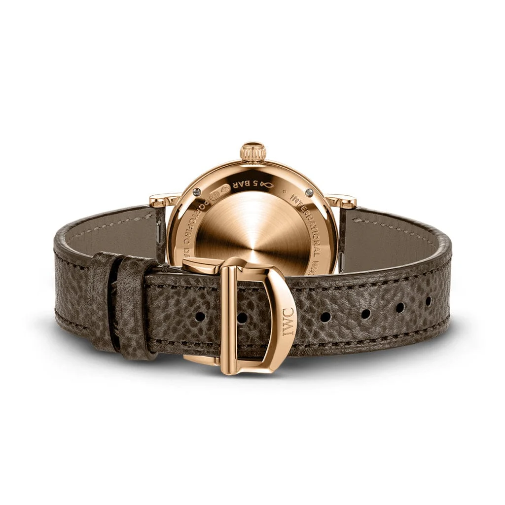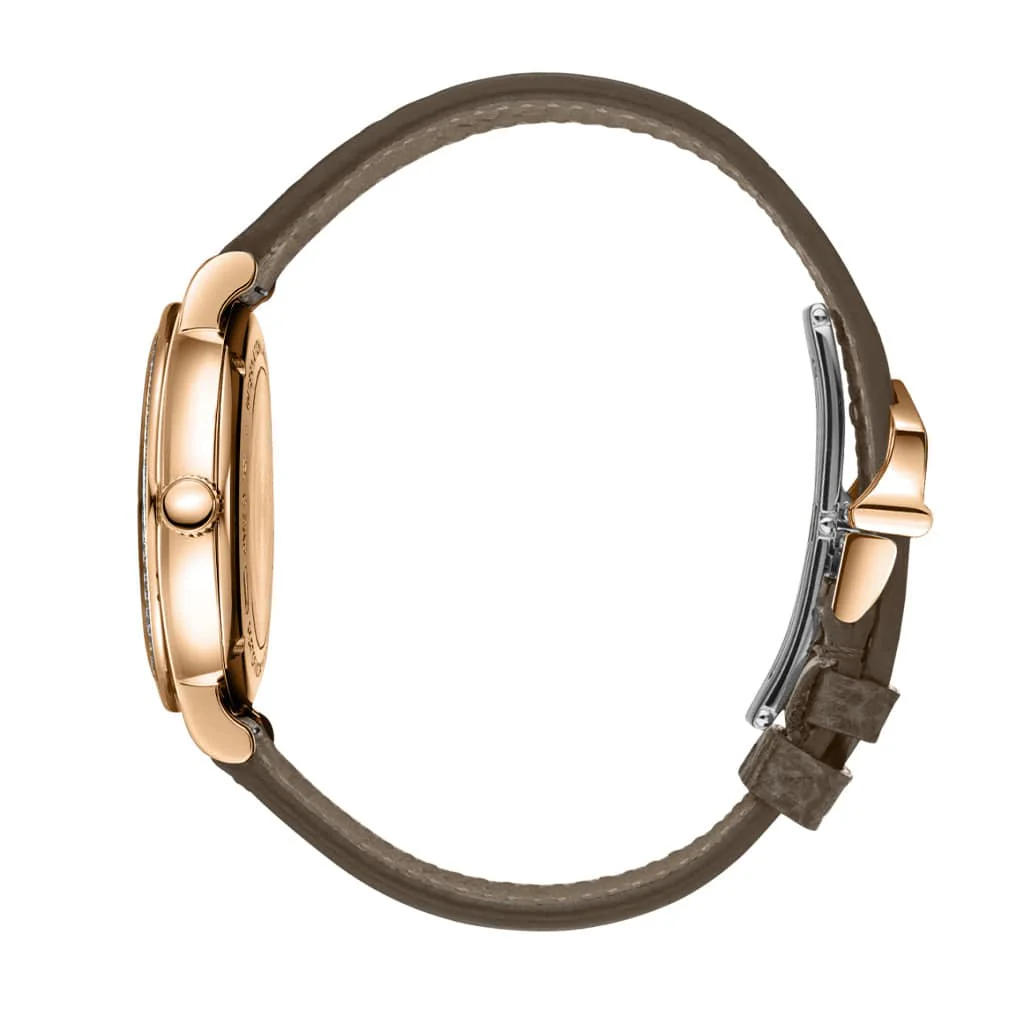 18 ct 5N gold case, Automatic, self-winding, Diameter 34.0 mm, Taupe leather strap with quick-change system, Strap width 16.0 mm.