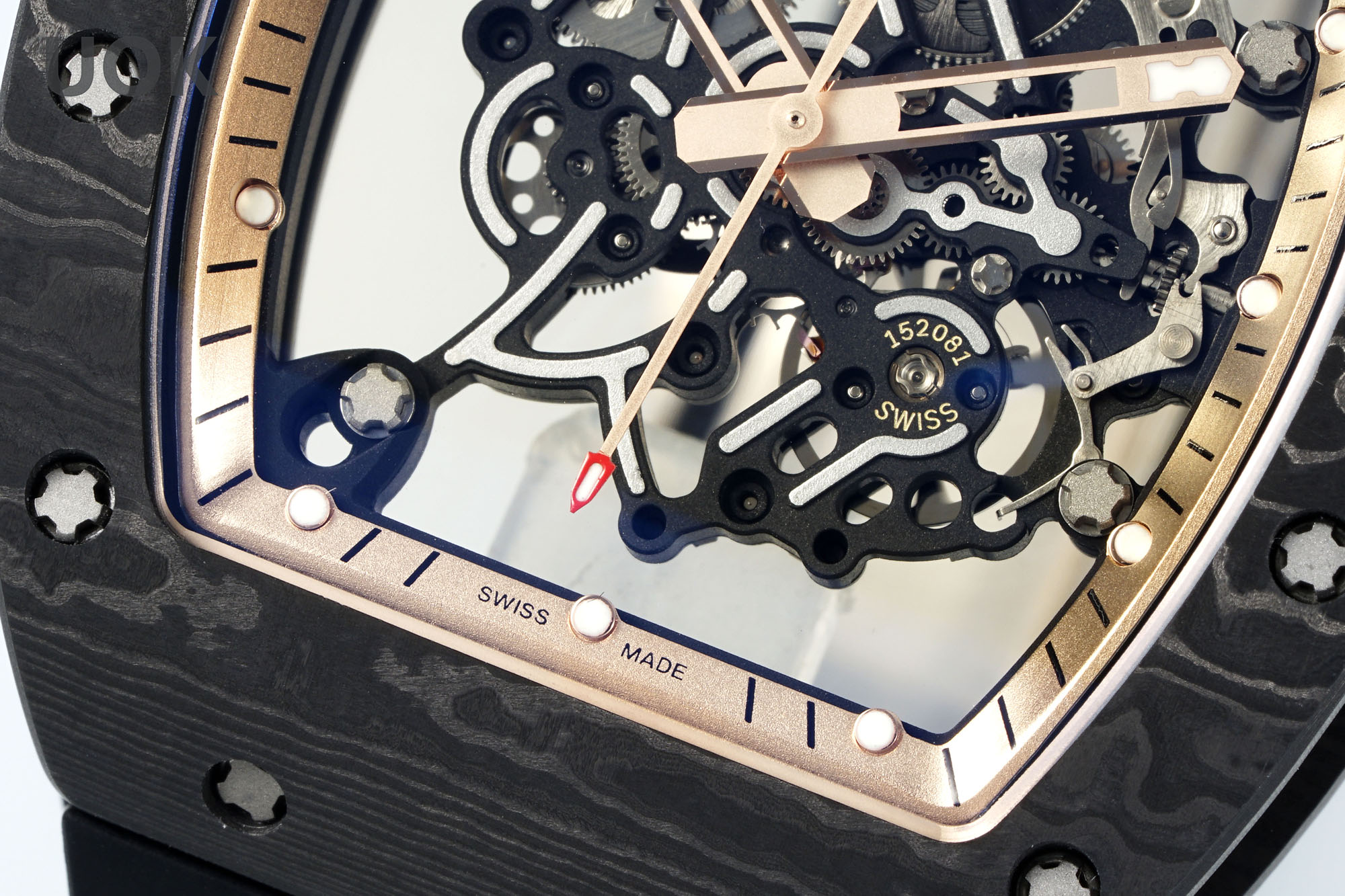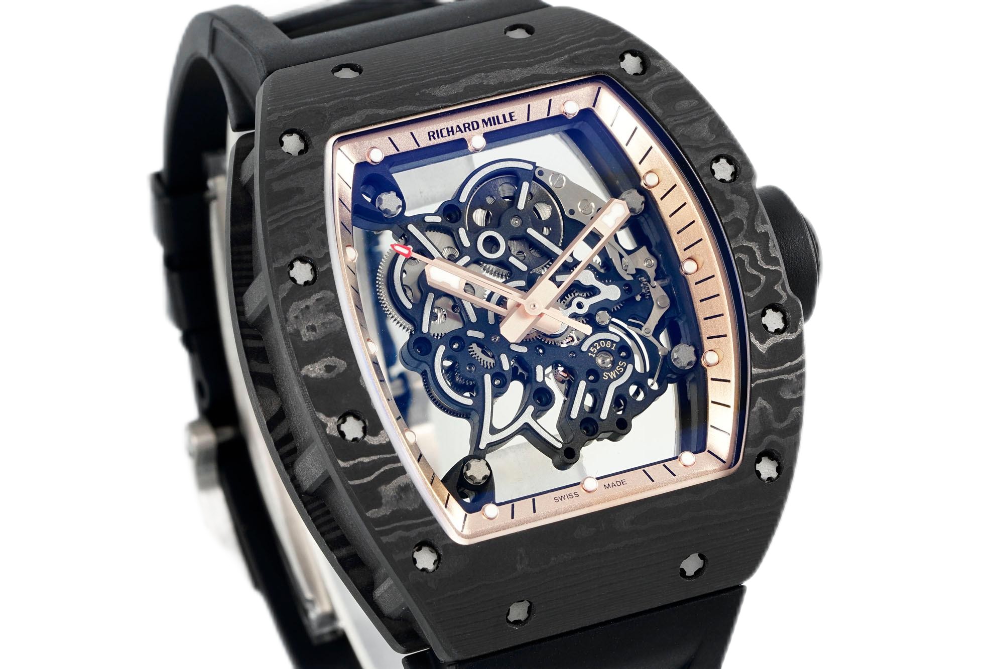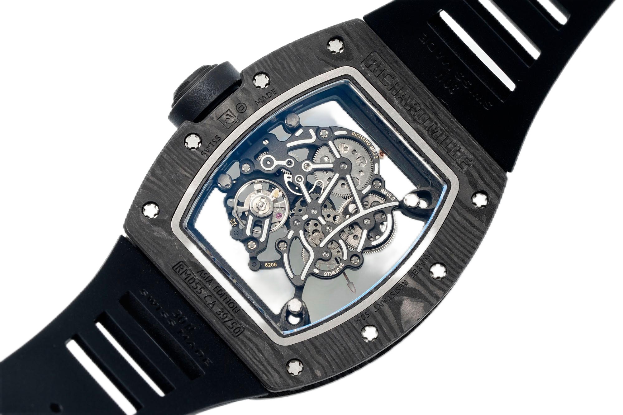 Experience luxury and innovation with the Richard Mille RM055 Skeleton Watch. Made with precision, this timepiece incorporates a durable carbon fiber dial and light titanium case for strength and comfort. Weighing only 74.3g, it has no equal in lightness and is perfectly suitable for daily wear and adventure. It has a transparent skeleton design showing the delicate Swiss movement in the most unique way. Its strap, sleek and black, is made from rubber to ensure your comfort while keeping a firm hold. Equipped with a scratch-resistant sapphire crystal and 50 meters of water resistance, the watch definitely exudes style with its performance. Step up your watch collection with this premium replica.