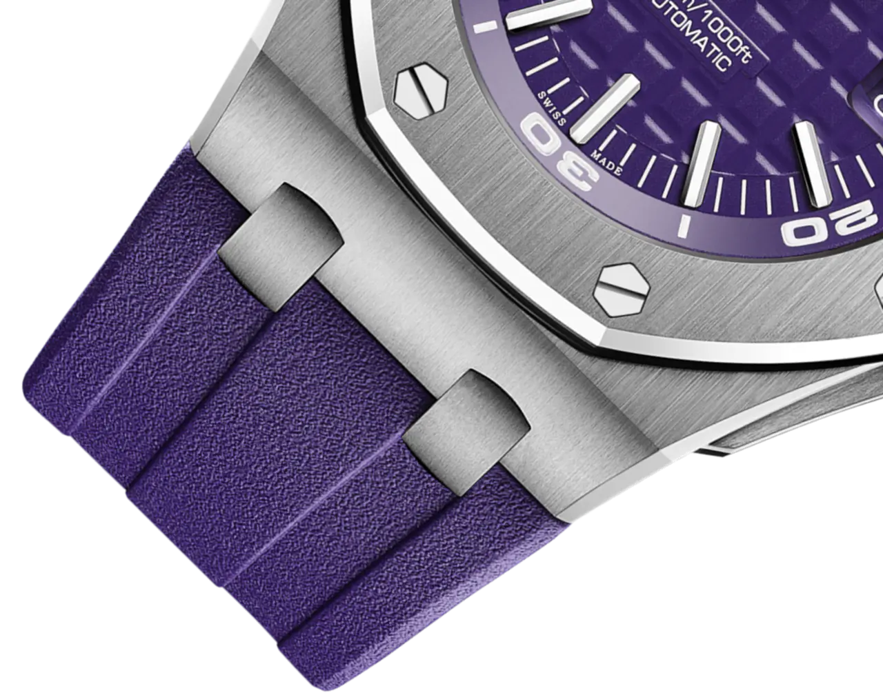 Purple dial with “Méga Tapisserie” pattern, white gold applied hour-markers and Royal Oak hands with luminescent coating, purple rotating inner bezel with zone from 60 to 15 minutes in white.