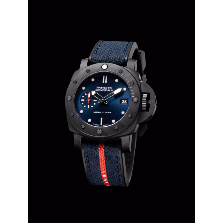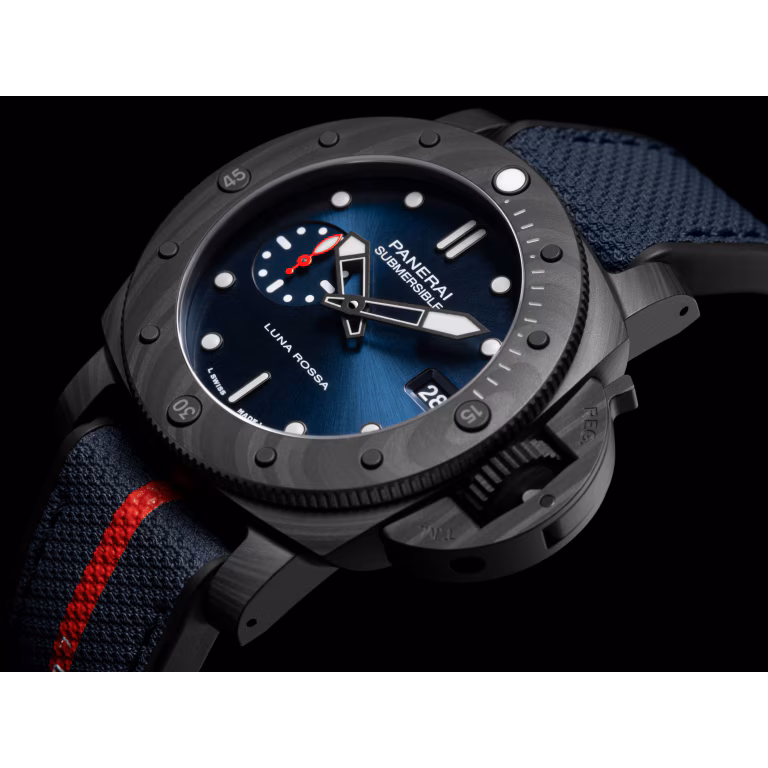 Blue sun-brushed with luminous hour markers and dots. Date at 3 o’clock, small seconds at 9 o’clock.