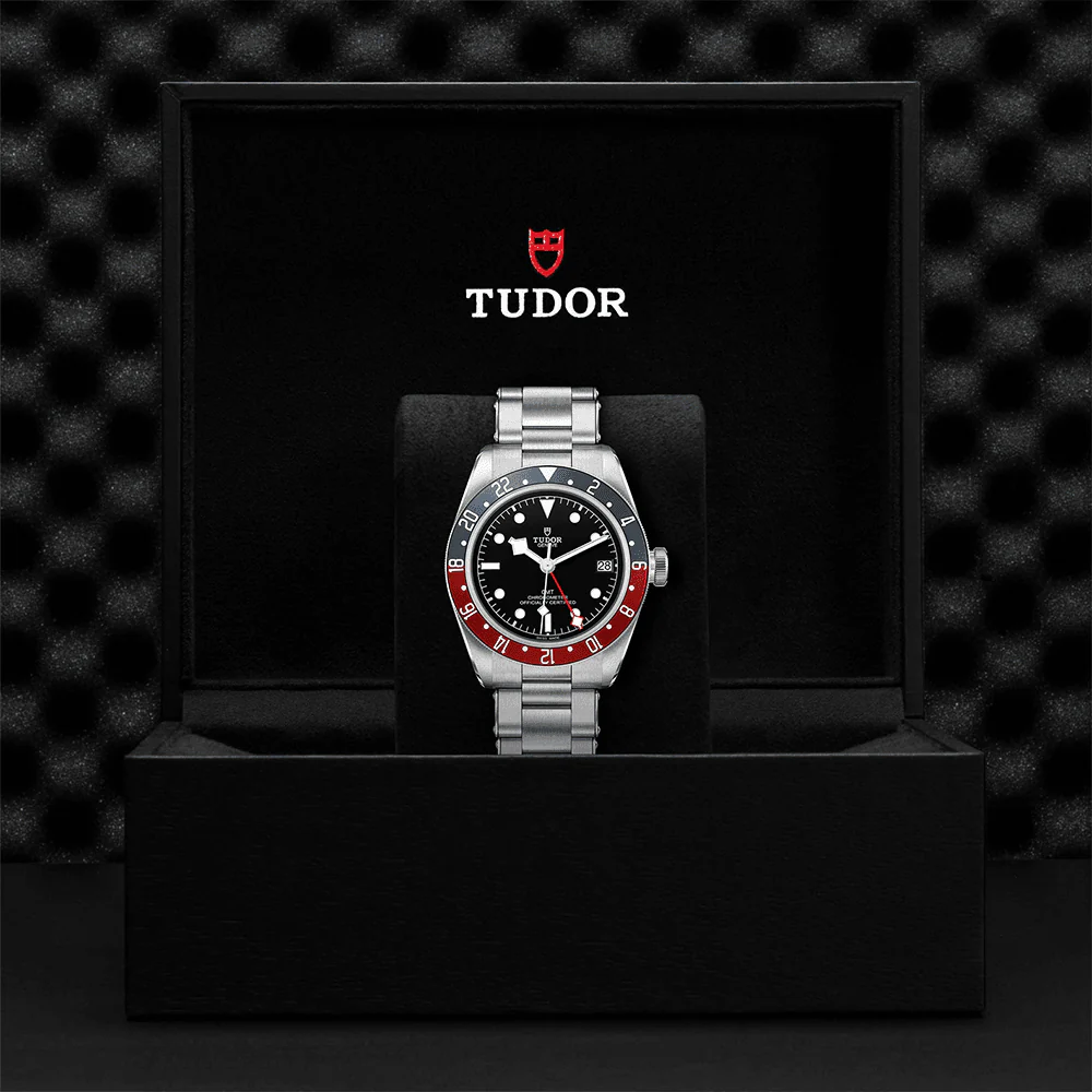 The men’s 41mm Tudor GMT watch Features a sapphire glass lens integrated with anti reflective and scratch resistant properties. Its seals to the surface of the steel watch case, helping to maintain a high level of water resistance. Inside the case of this Tudor Black Bay GMT watch is the impeccable Calibre MT5652 self-winding movement. The COSC-certified engine is capable of providing an impressive 70-hour power reserve and Features a bidirectional rotor system and built-in architecture, developed by the skilled hands of a Tudor watchmaker.