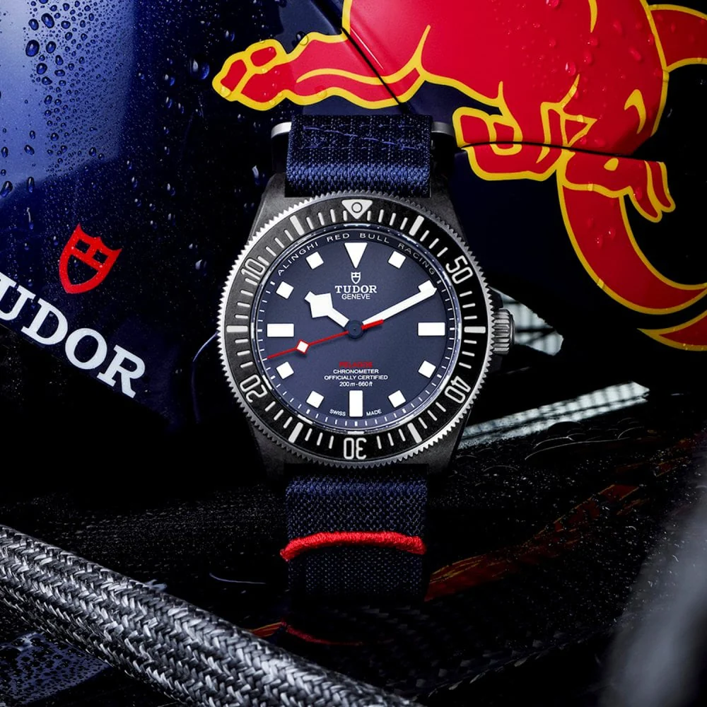 TUDOR Pelagos FXD x Alinghi Red Bull Racing Edition 42mm Men's Automatic Watch M25707KN-0001. Carbon composite 42mm case and bezel all on a blue fabric strap. This matte blue dial with luminous applied hands and hour markers, red seconds hand. Special caseback engraved with Alinghi Red Bull logo. Waterproof up to 200m and sapphire crystal glass. Power reserve up to 70 hours. Calibre MT5602 automatic COSC certified movement.